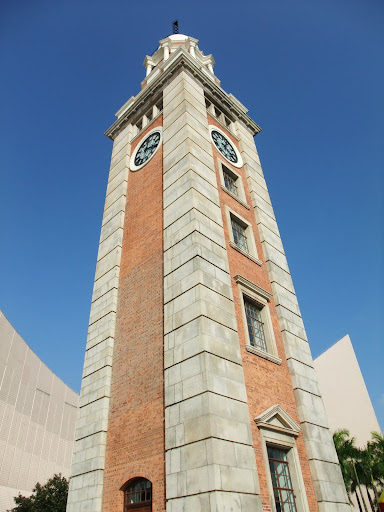 文化中心前矗立著知名古蹟「舊九龍火車站鐘樓」,由紅磚與花崗岩建成,