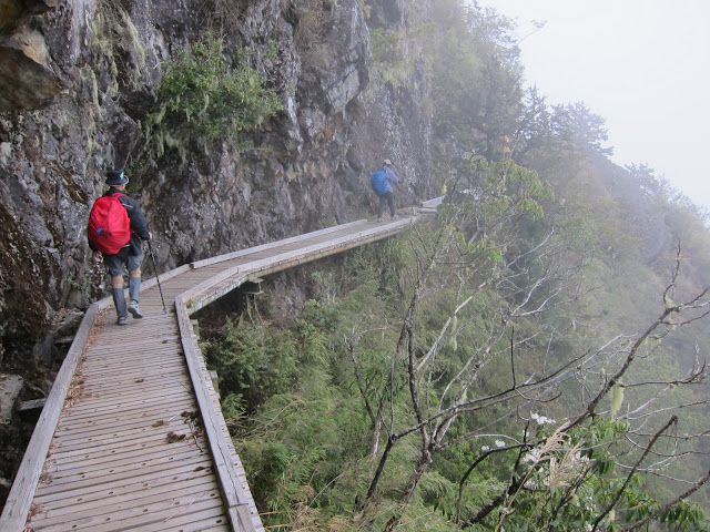 幾個崩塌路段走起來提心吊膽之餘,最大的不利因素就是鬼天氣:最初走在雲裡不過沾沾露水而已,